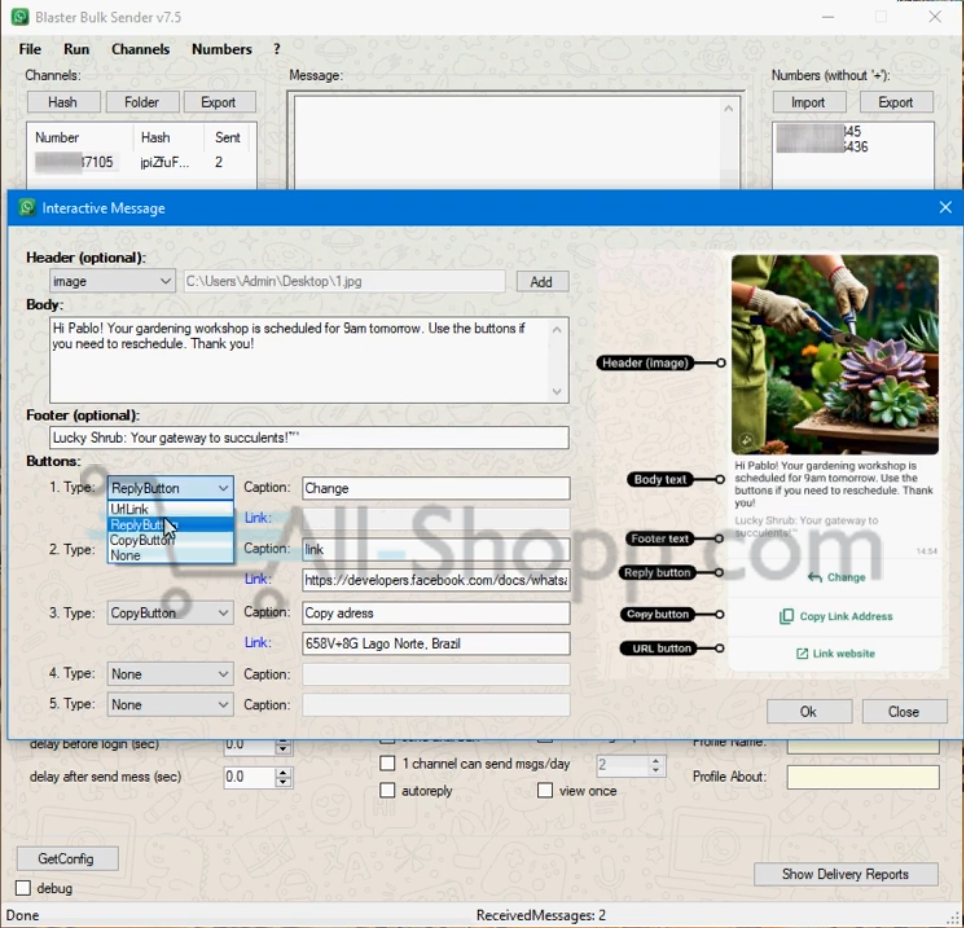 - Added: interactive messages with “Reply Buttons”, “URL buttons”, “Copy buttons”