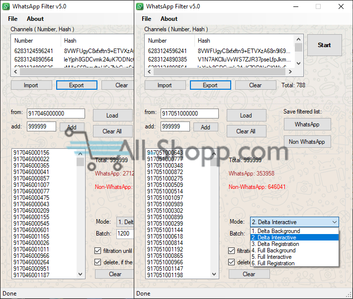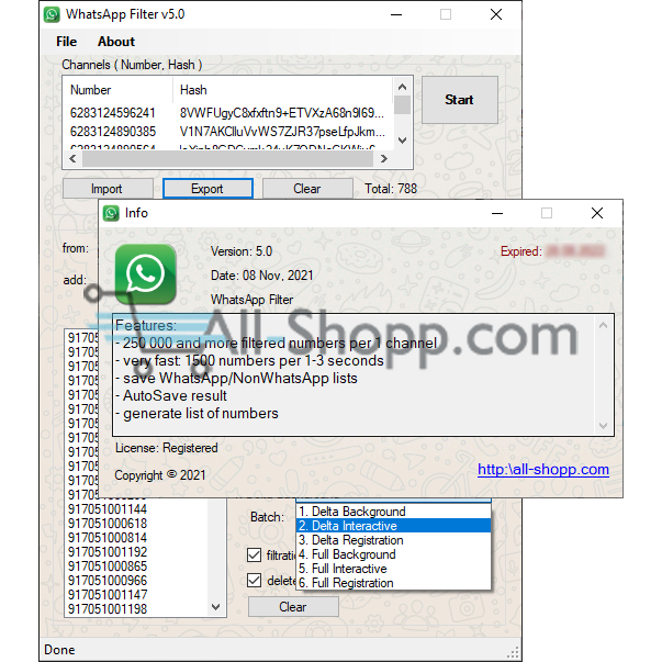 WhatsApp Contact Filter 2024 | All-shopp.com – This software can filter of any bulk phone number you have or from scraped list, this software can separated which number used whatsapp and which number not used whatsapp.