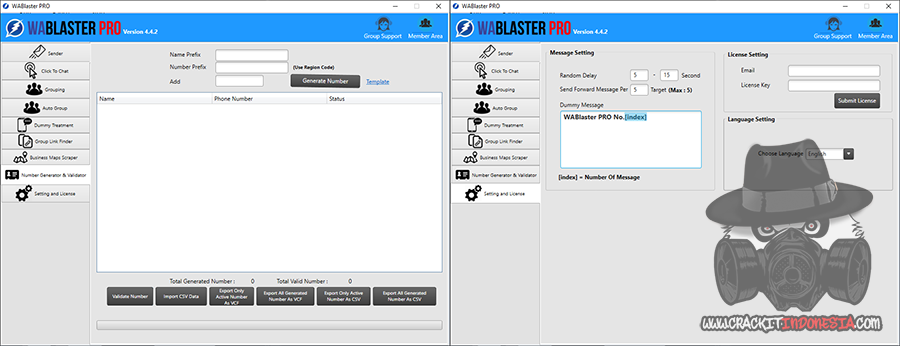 Memngkinkan kita untuk membangun database kontak yang tidak terbatas, Anda bisa men-generate kontak berdasarkan prefix HLR operator selular dan wilayah kota/kabupaten tertentu, lalu otomatis menfilter/menvalidasi nomor-nomor yang terdaftar di whatsapp dan tidak.